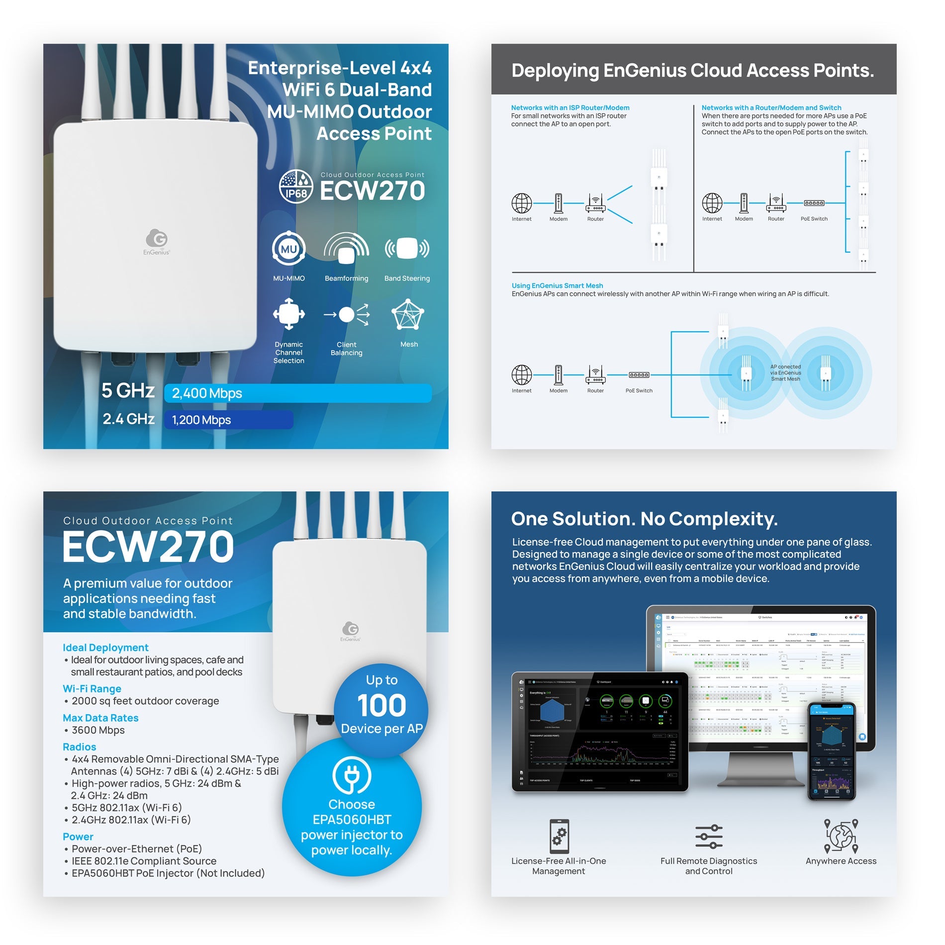EnGenius Cloud Managed ECW270 outdoor Wi-Fi 6, 4x4, IP68, MU-MIMO dual-band access point reaches speeds up-to 2,400 Mbps in 5GHz and 1,200 Mbps in 2.4GHz band. This top-of-the-line cloud-managed AP features the latest in rugged weatherproofing and Wi-Fi 6 technology with guaranteed top-notch performance and reliability in the harshest environments.