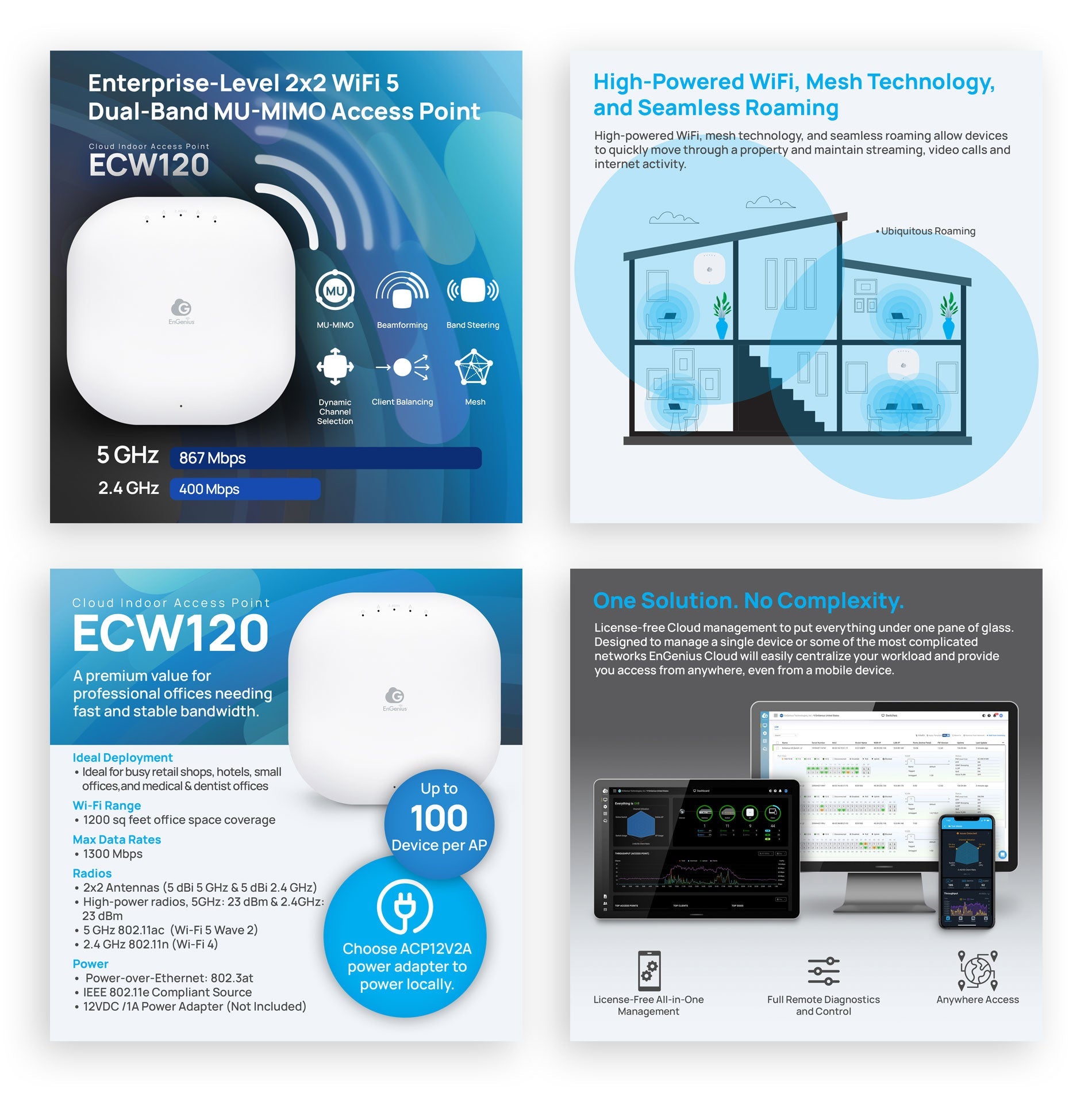 EnGenius Cloud Managed ECW120 Wave 2 WiFi 5 Indoor Access Point delivers 1.3 Gbps speeds and higher user capacity. It supercharges performance up to 30% faster than legacy 11ac Wave 1 APs. This dual-band AP with MU-MIMO and Beamforming features meshing, supports PoE, and improves connection reliability for business-class Wi-Fi.