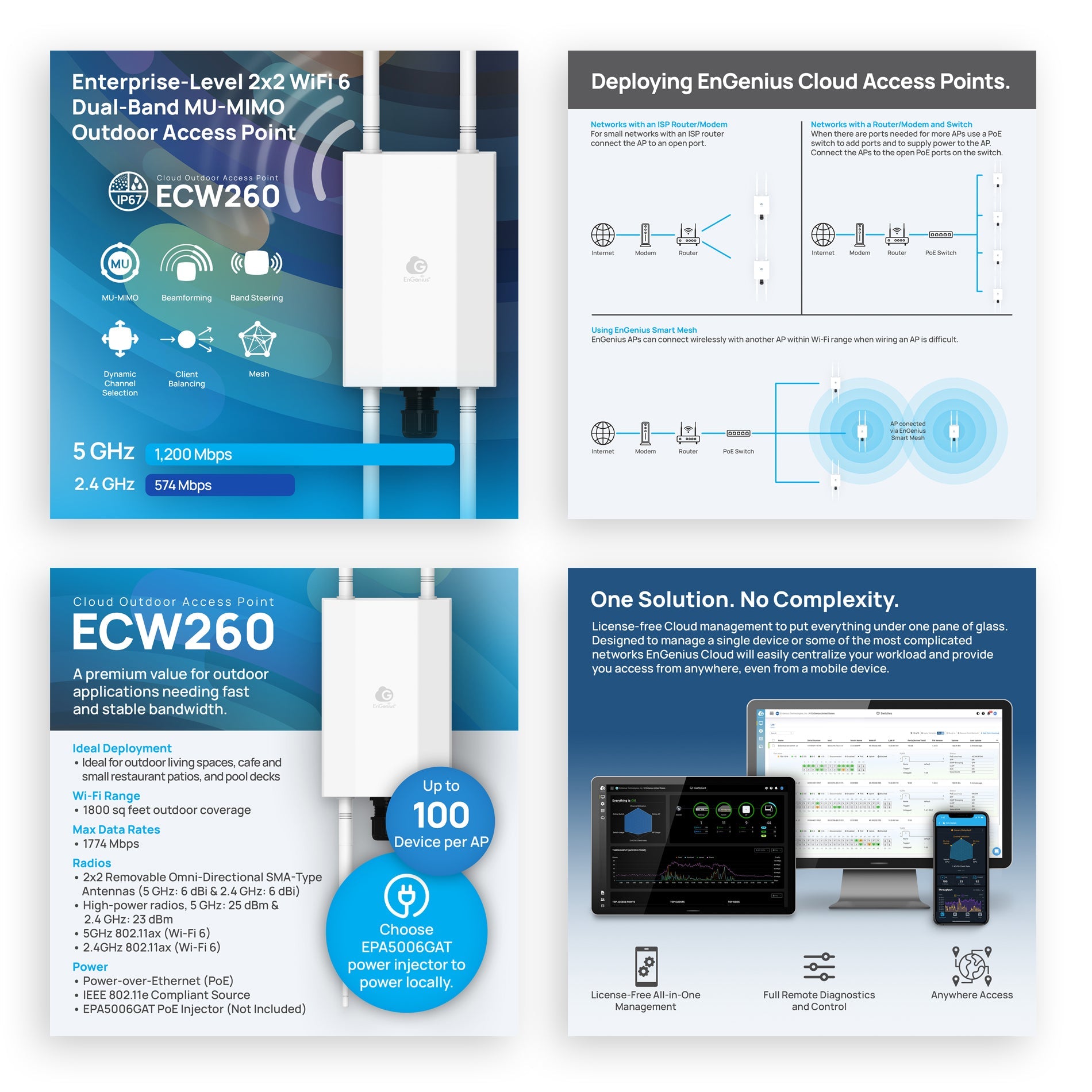 EnGenius Cloud Managed ECW260 Outdoor Wi-Fi 6, 2x2, IP67, MU-MIMO Dual-Band Access Point reaches speeds of 1,200 Mbps on 5GHz and 574 Mbps on 2.4GHz band. This top-of-the-line cloud-managed AP features the latest in rugged weatherproofing and Wi-Fi 6 technology with guaranteed top-notch performance and reliability in the harshest environments.