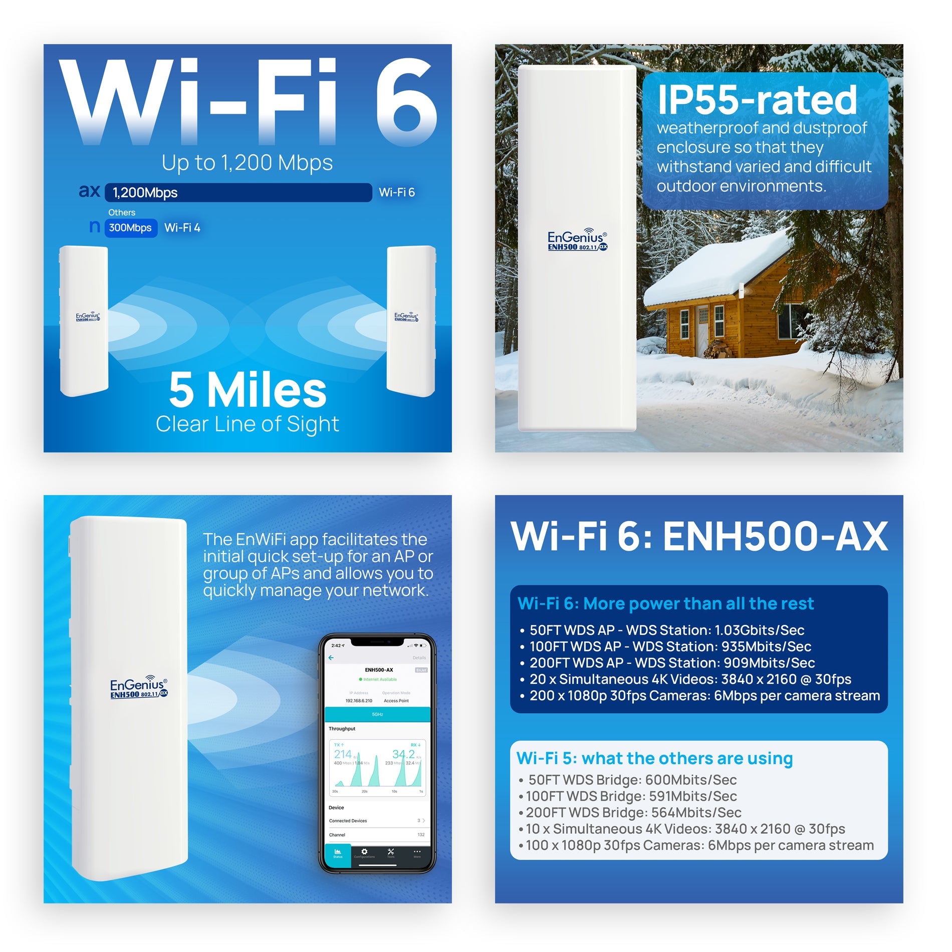 The EnGenius ENH500-AX 5GHz (802.11ax) Wi-Fi 6 Outdoor 2x2 Wireless Bridge features the newest generation of wireless technology delivering high density Wi-Fi performance transmissions between buildings and across large outdoor properties without the exorbitant cost of running fiber cable. With advantages over the older Wi-Fi standards, the Wi-Fi 6 bridge significantly increases throughput, supports greater efficiency, and accommodates 8k ultra HD video and heavy multi-application traffic with extended bandwidth over greater distances. The Wi-Fi 6 “invisible wire” bridge uses the latest in Wi-Fi technology to achieve longer ranges when paired with another Wi-Fi 6 bridge in a point-to-point/multiple point deployment.