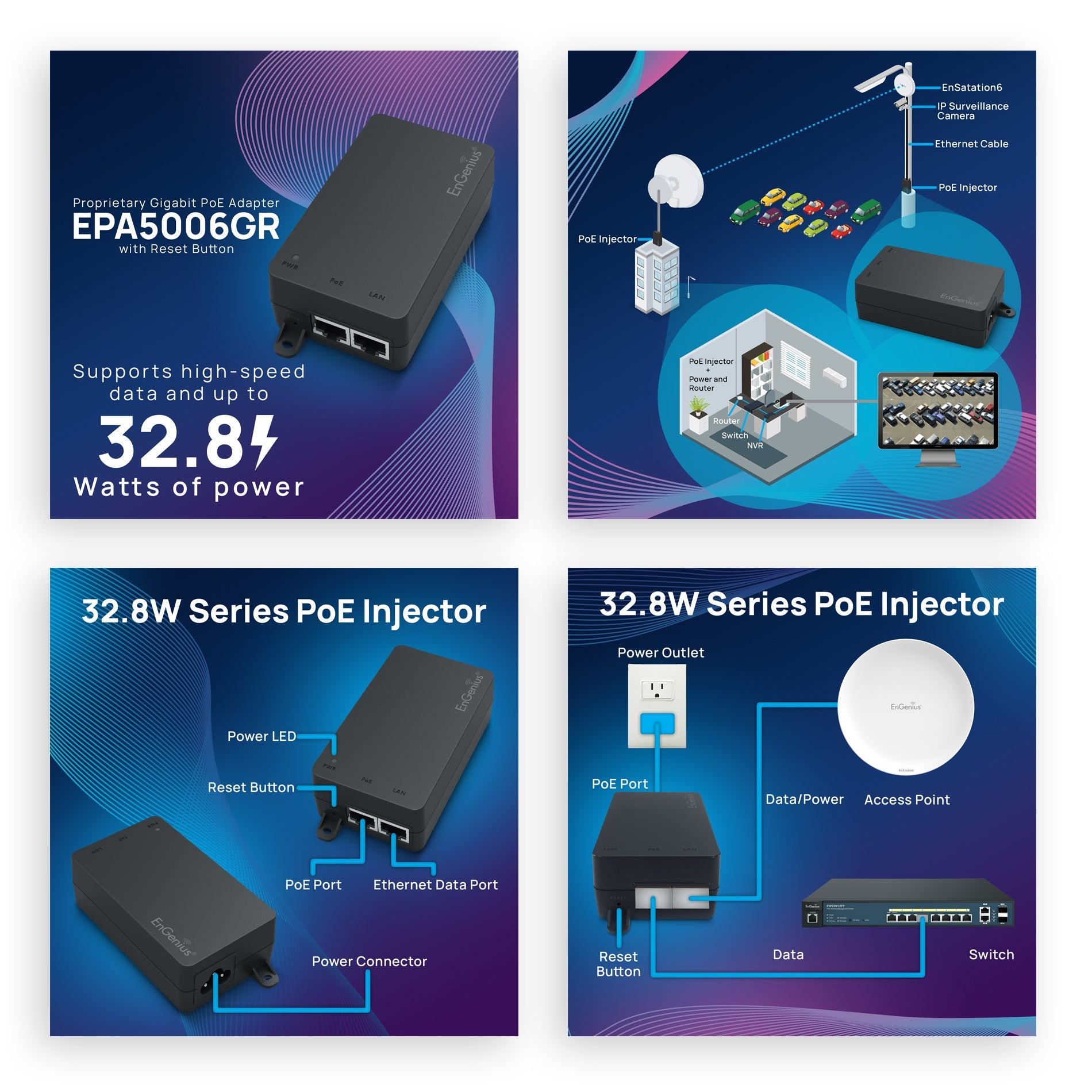 The EnGenius EPA5006GR gigabit proprietary Power-over-Ethernet adapter supports high-speed data and up to 32.8 watts of power. Compact port design provides easy installation, and built-in power surge