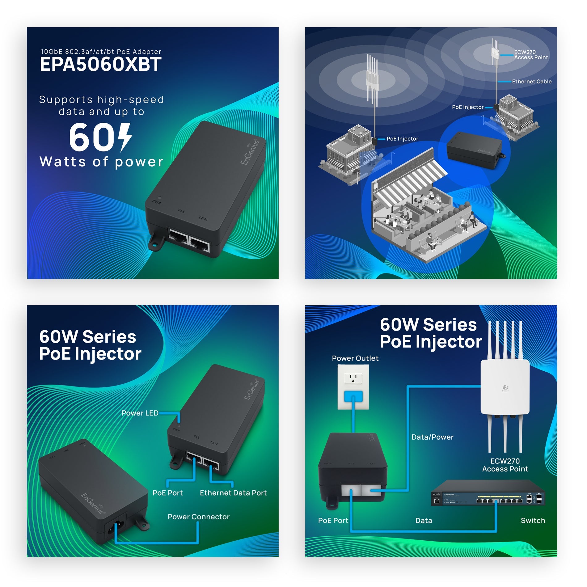 The EnGenius EPA5060XBT PoE Injector delivers 60-watts of power and 10Gb data communication to compatible network devices up to 328 feet (100m) over Cat5e cable. Compact design with IEEE802.3bt compliance offers easy installation while providing built-in power protection to preserve valuable equipment.