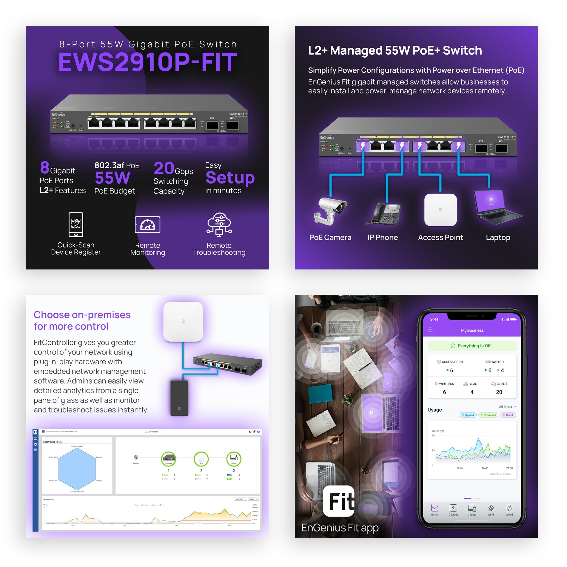 EnGenius Fit Managed Switch EWS2910P-FIT is an 8-port Gigabit PoE Layer 2 plus switch with a 55W PoE budget and 2 SFP uplink ports. It offers multiple management options for small business network environments, allowing you to select the cloud or on-premises management option that best suits your needs. With its business-class features, the EnGenius Fit Managed Switch provides secure, reliable, and high-performance switching while reducing capital and operating expenses for cost-conscious small businesses.